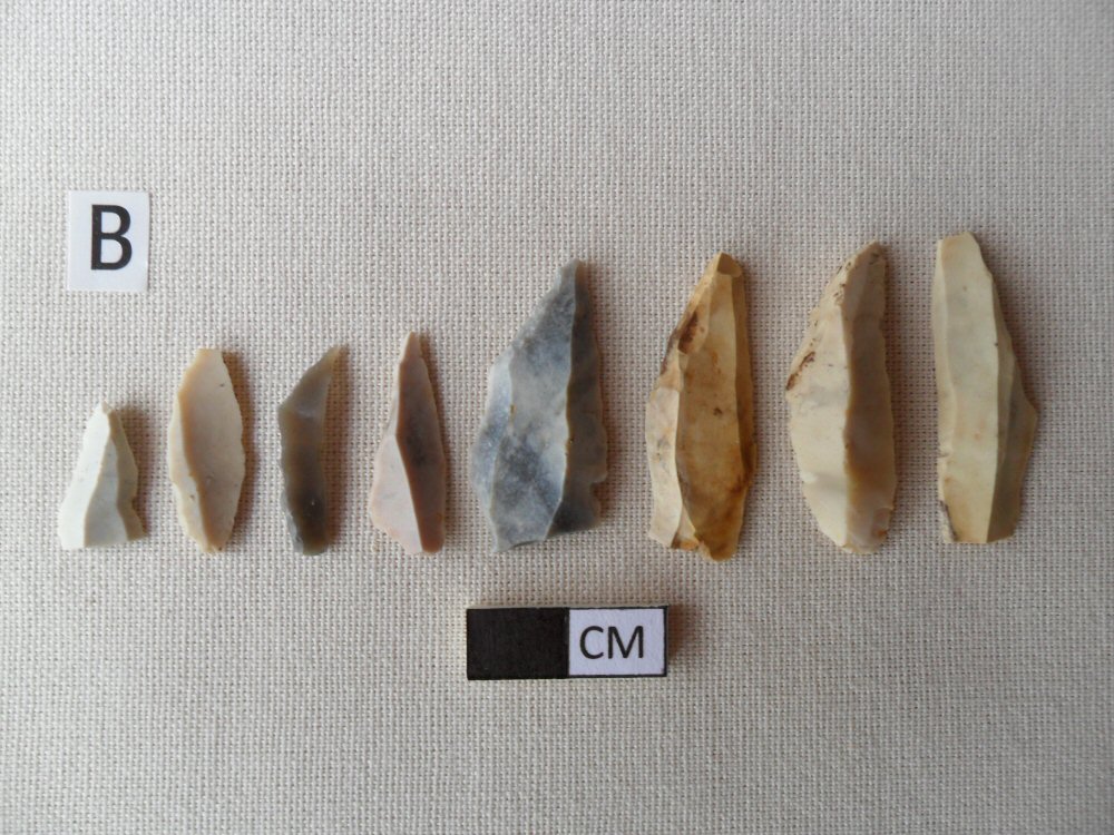 In Photograph B are a group of tools known as microliths. These are small blades struck from a flint nodule and worked to produce a variety of tools. Some of these tiny blades were used to construct composite tools such as arrows and harpoons by hafting several individual blades along a wooden shaft.
