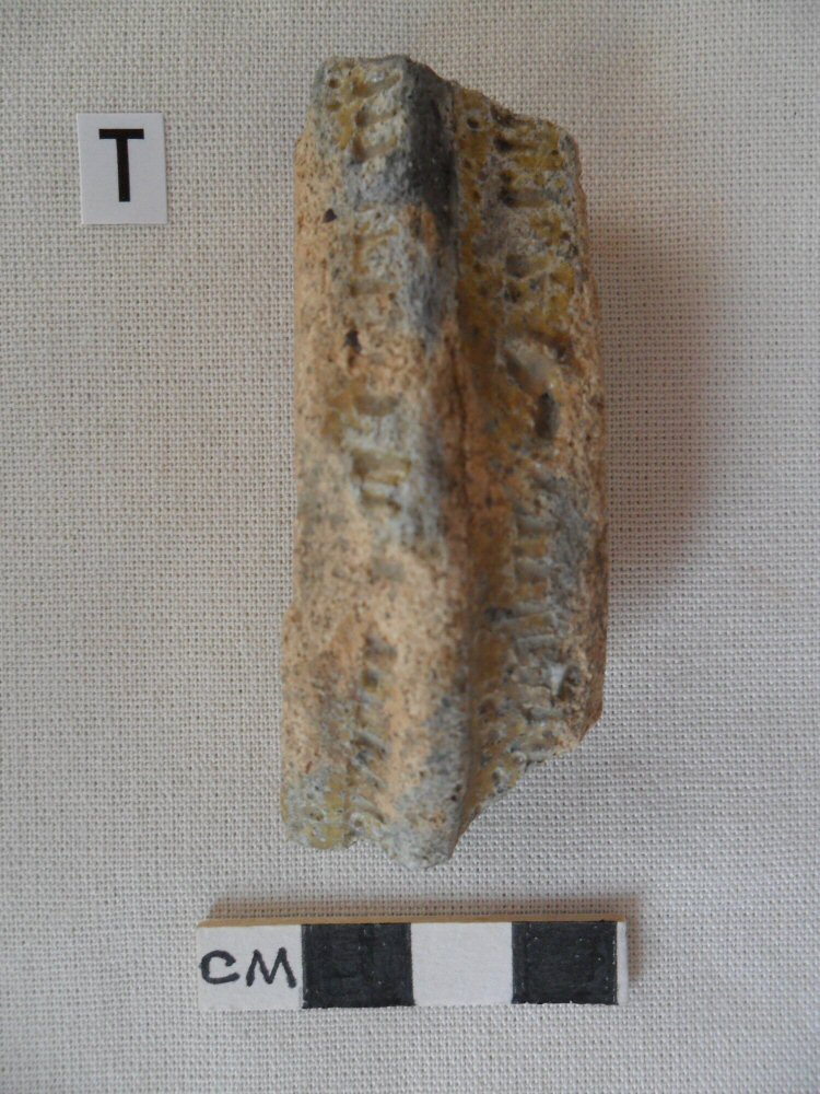 Photograph T has a Midland white-ware handle with distinctive rouletting decoration in two lines along the length of the handle. It has a partial yellow-green glaze.