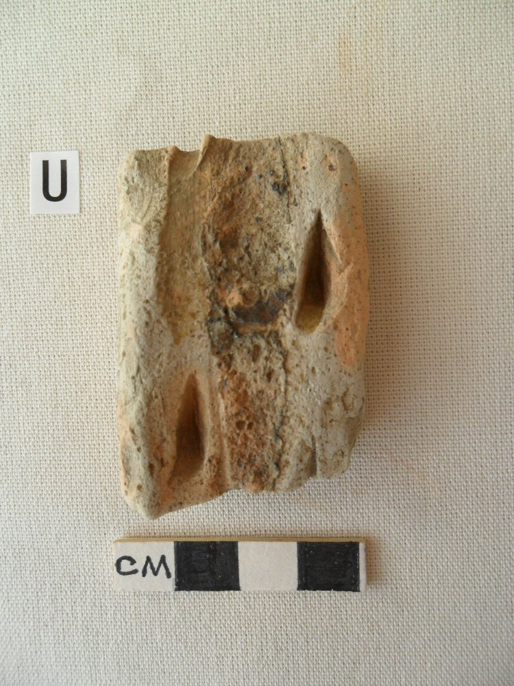 A Midland white-ware handle with two complete slashes and two partial slash marks is shown in Photograph U. This piece has yellow glaze within the decoration.