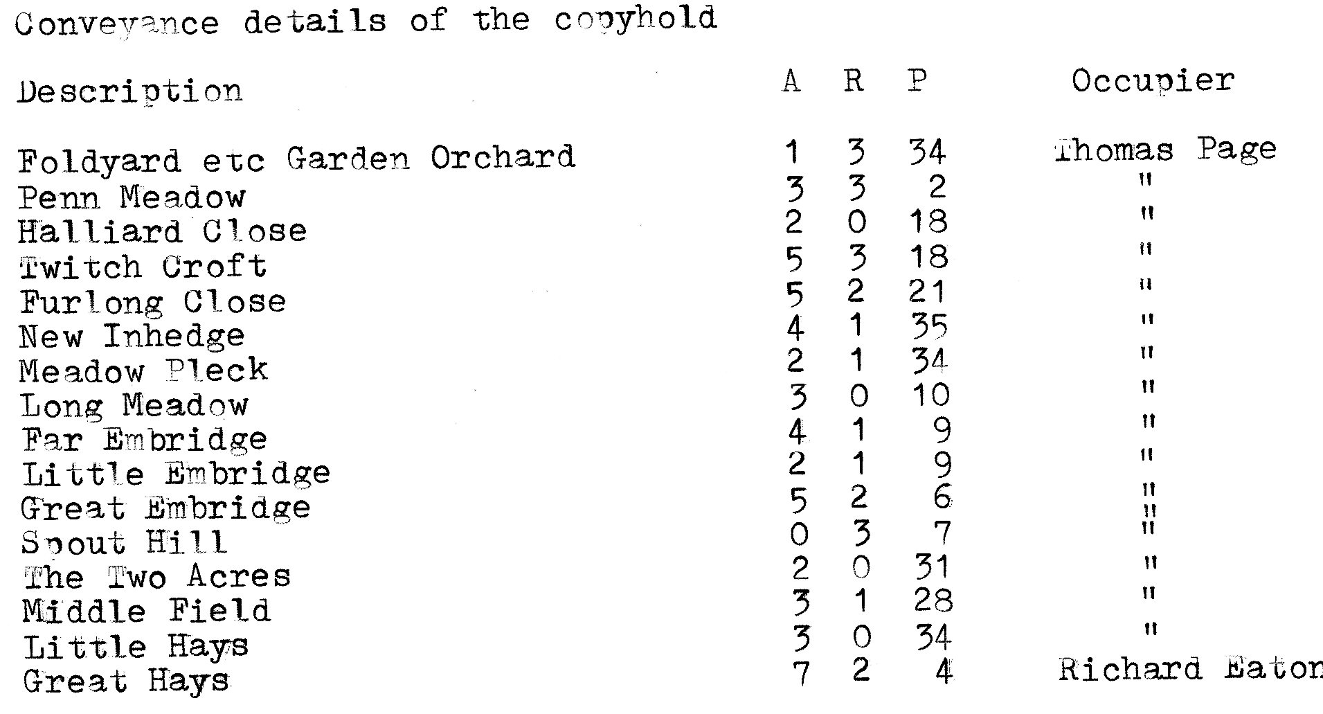 George Boraston and Elizabeth surrender to the Manor Court... '' And all the meadow called Long Meadow two other meadows called Bare Meadows , on close called the Stockings, one other close called The New Lyes,three other closes called the Three Riddings, one other close called the Long Innage, one other close calledOrchard Furlong, two other closes called Dunstall Closes, on other close called the Bottle Moore, one other close or meadow calledthe Mill Close or Mill Meadow,two small pieces called the Moors and also all other the copyhold lands, tenements and hereditaments... in the possession or holding of John Southwick, to the use and behoof of Reverend John Durant of Hagley, his heirs and assigns for ever according to the custom of the said Manor''.